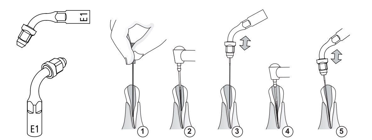 Końcówka E1 - skaler ENDO 1200 uchwyt skalera dla narzędzi kanałowych fi 0,8 - pilniki typu U, zwykle używany do czyszczenia kanałów przednich zębów, sterylizowania oraz wyjmowania pozostałości z kanału zęba